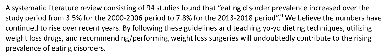 The guidelines acknowledge the social determinants of health, health disparities, racism, and weight stigma, as impacting health and weight status but then contradict these observations by recommending practices that are stigmatizing; which is associated with poor health outcomes including all-cause mortality.(8) Most weight related studies correlate poor health outcomes to being higher-weight without controlling for weight stigma, weight cycling, or healthcare inequities, all of which are researched to be directly harmful to health.
